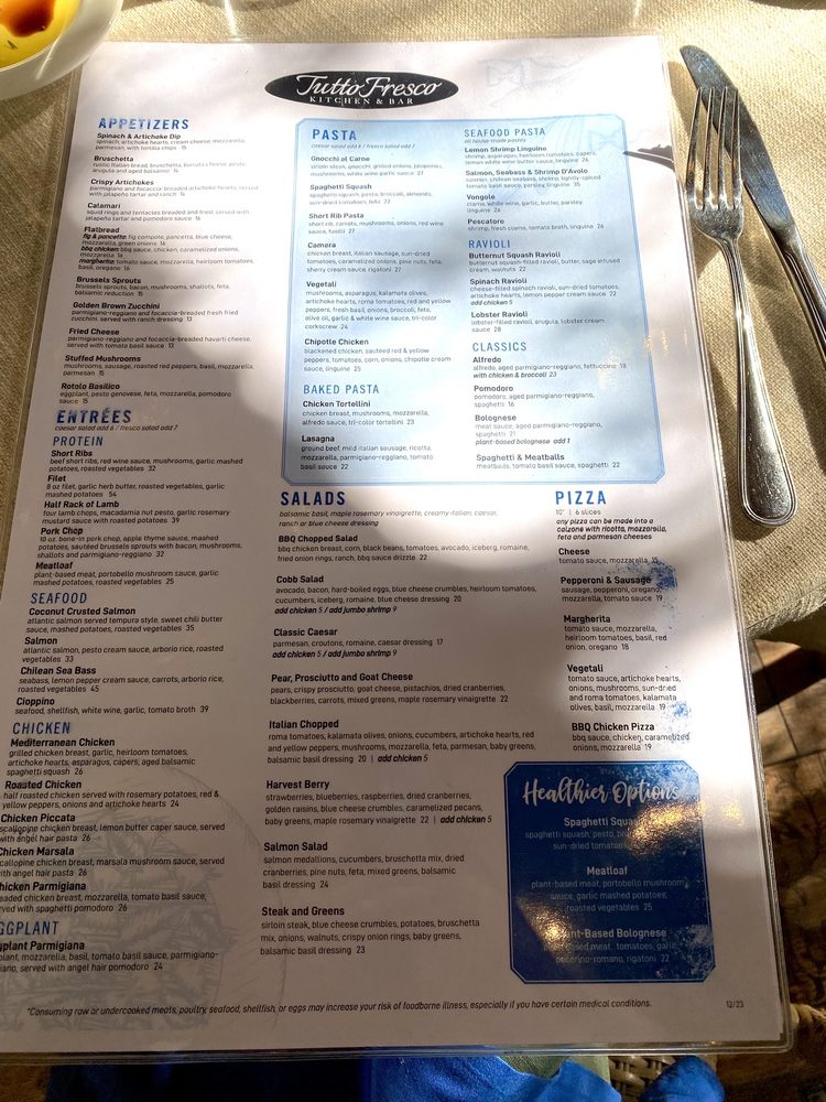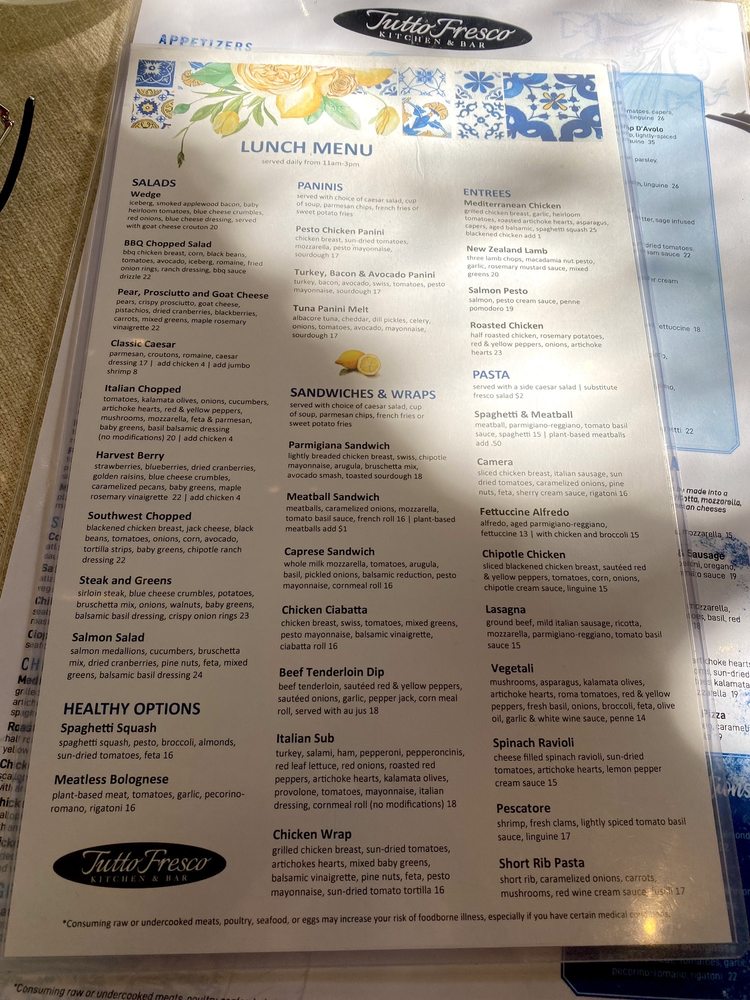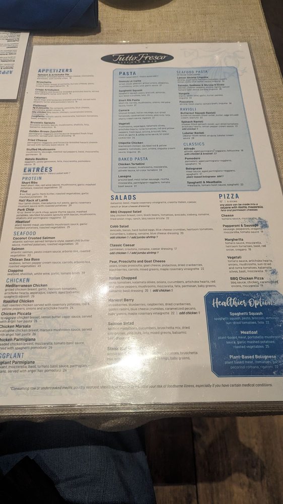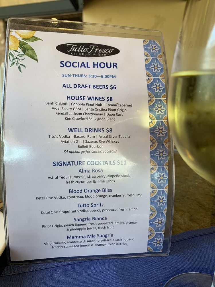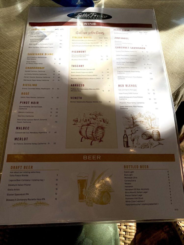 Introducing the menu at Tutto Fresco, located in Rancho Santa Margarita, CA. This casual yet classy restaurant offers a wide range of options for brunch, lunch, dinner, and dessert. With vegan and vegetarian choices, as well as catering services and outdoor seating, Tutto Fresco caters to diverse preferences. Customers praise the delicious wines, appetizers, and entrees, such as the famous tuna melt and focaccia bread. The attentive service and pleasant ambiance add to the overall dining experience. Despite minor delays in seating, the restaurant's redeeming qualities shine through. Whether you're craving Italian classics like chicken piccata or unique dishes like fried artichoke and calamari, Tutto Fresco delivers exceptional flavors and quality. Visit for a memorable dining experience with friends and family.