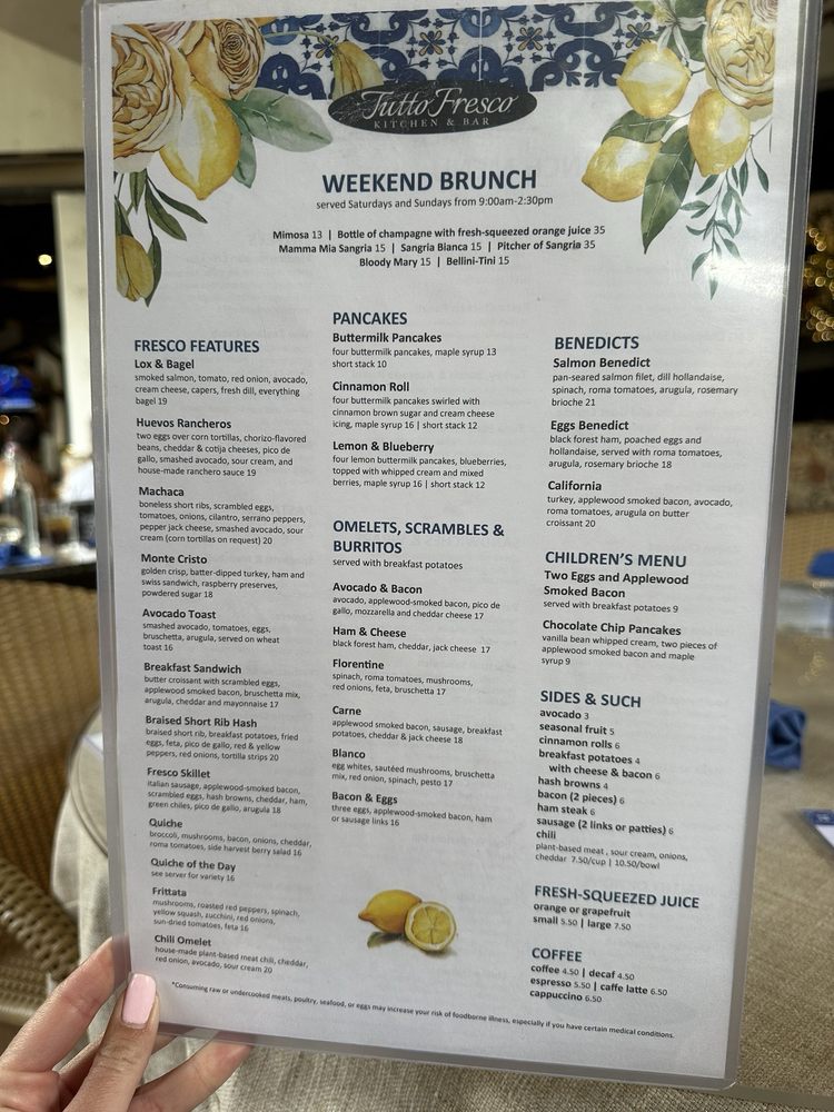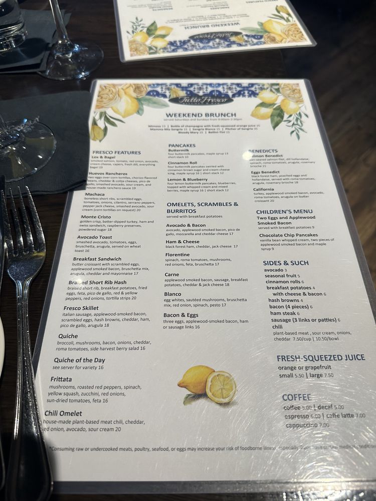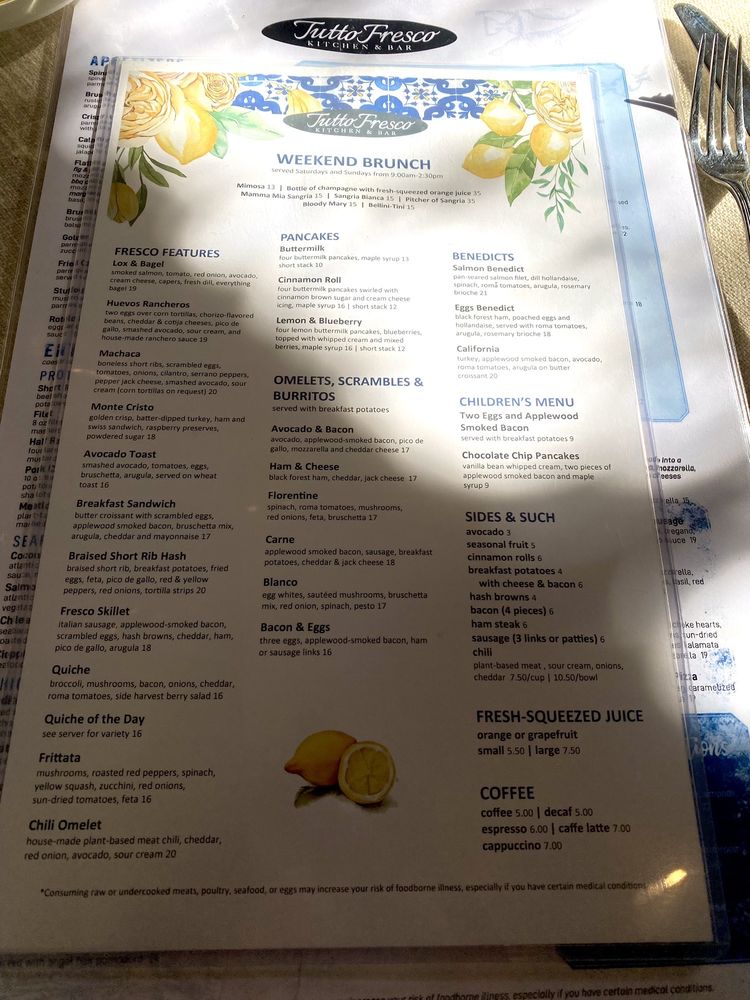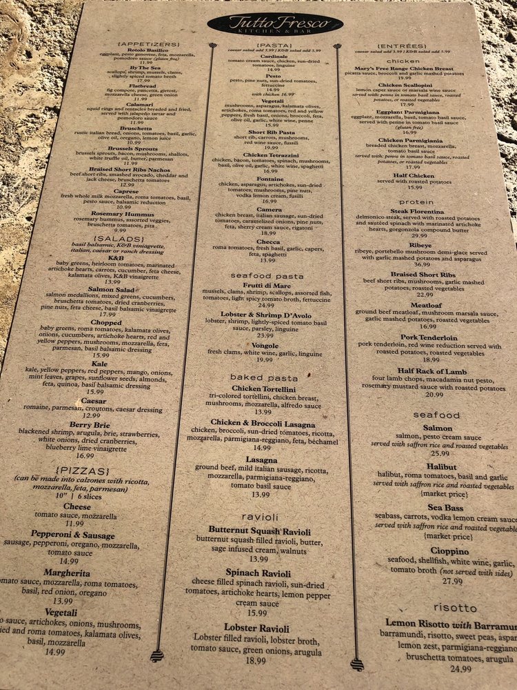 Introducing the menu at Tutto Fresco, located in Rancho Santa Margarita, CA. This casual yet classy restaurant offers a wide range of options for brunch, lunch, dinner, and dessert. With vegan and vegetarian choices, as well as catering services and outdoor seating, Tutto Fresco caters to diverse preferences. Customers praise the delicious wines, appetizers, and entrees, such as the famous tuna melt and focaccia bread. The attentive service and pleasant ambiance add to the overall dining experience. Despite minor delays in seating, the restaurant's redeeming qualities shine through. Whether you're craving Italian classics like chicken piccata or unique dishes like fried artichoke and calamari, Tutto Fresco delivers exceptional flavors and quality. Visit for a memorable dining experience with friends and family.